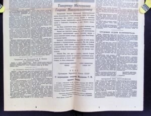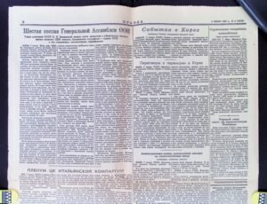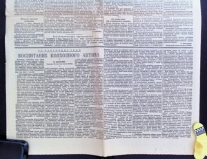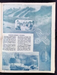 46. Газети: вирізка з газети з заміткою про Нісу авторства В. Массона; Туркменська фото-газета (щомісячний ілюстрований журнал) № 8 за 1948 р. з розворотом про розкопки Ніси; газета Правда за 8 січня 1952 року, яка лежала разом з документами