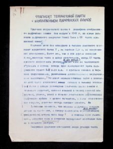 - Опис: Стаття М. Вязьмітіної 1957 р. “Фрагмент теракотової плити із зображенням парфянських воїнів”, машинопис, варіант 1